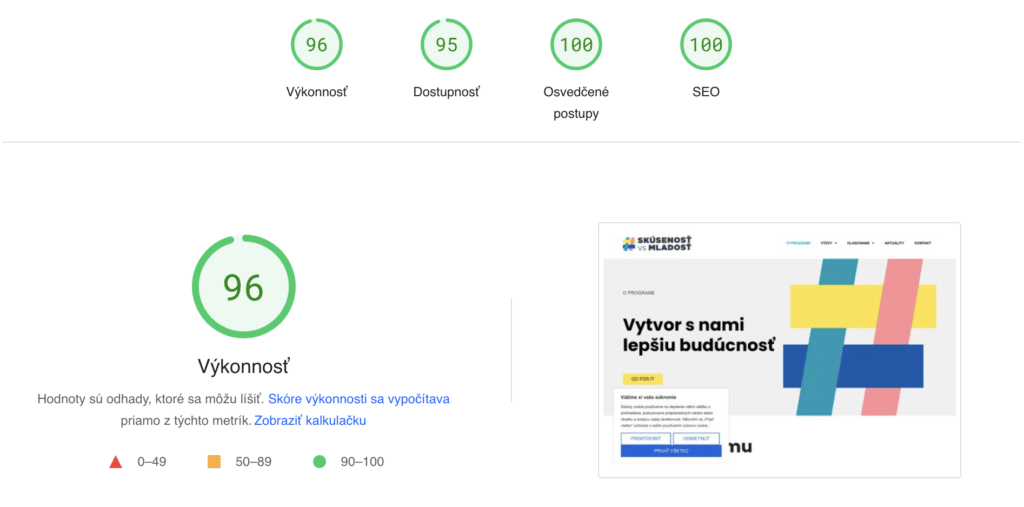 Aj keď webová stránka neprešla kompletnou a hĺbkovou optimalizáciou načítania, od Google dostala výborné score.